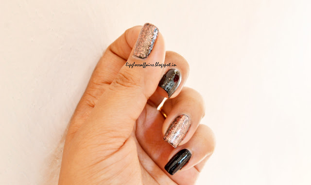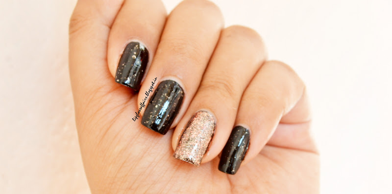 I have been hunting for China Glaze Cosmic everywhere and when i became desperate, yes really desperate i got my L.A.Girl's Black Out(i bought it at Lagos, W.A) from my stash and mixed it with a silverish glitter polish ( B.O from China, i have no idea about other details as i picked that when i was at Lagos, W.A last yr) and mixed it well. It sounds crazy right but well i loved the result. So today am here to show you that black polish which is a lil closer to China Glaze Cosmic or is it???