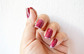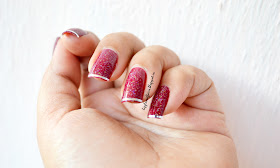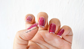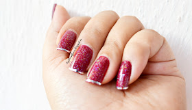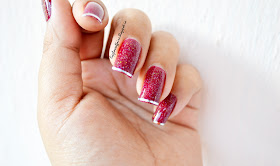 Its a pretty simple, quick and easy do-able mani. Only hitch i see is, the tape on tip of the nails don't stay for longer time. So for a quick vamp up of a plain mani for a party, this would be great!! And waste of tape and those few mins if you want it for a daily wear.